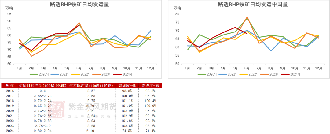 上半年BHP日均发运量79万吨/日,同比77万吨/日增2.4%;1-5月日均发运中国量66万吨/日,同比63万吨/日增5.1%。