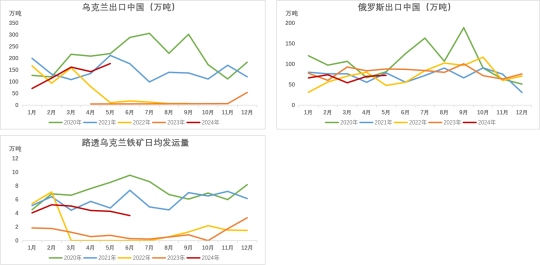 俄乌冲突仍未结束,但乌克兰已恢复从乌克兰港口对外出口的能力,一季度也恢复了想亚洲客户的销售。24年上半年日均发运4.4万吨/日,同比冲突开始之前21年的5.6万吨/日降21%。1-5月海关进口量669万吨,同比21年788万吨减119万吨,发运目前基本已恢复正常水平。俄罗斯铁矿出口中国量几乎未受冲突影响。