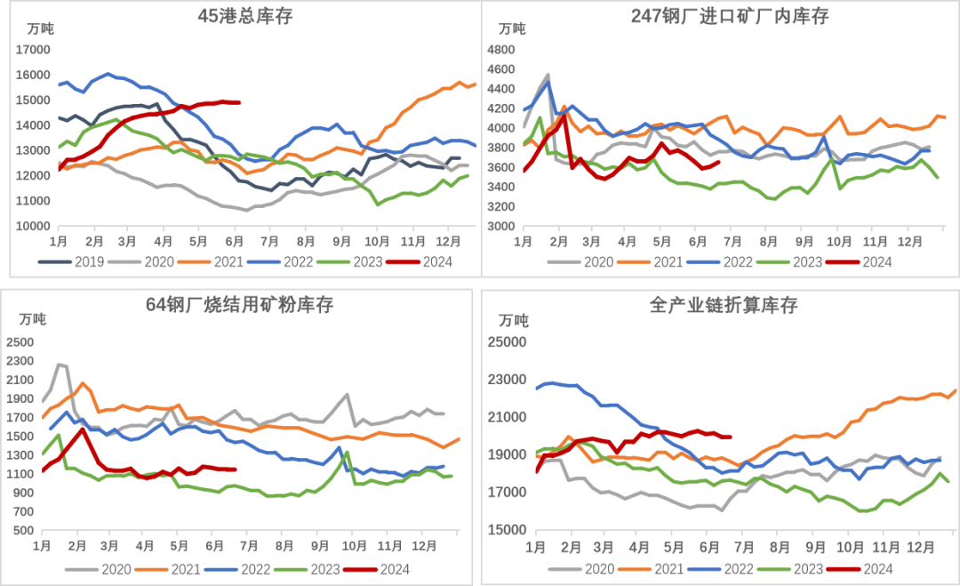 海外高发运情况下,国内二季度需求并为出现超预期增长,上半年铁矿全产业链库存累库约1800万吨至2亿吨水平,且钢厂仍旧采取降低原料库存策略,使得港口现货库存持续累库,至6月底45港已累库2600万吨。