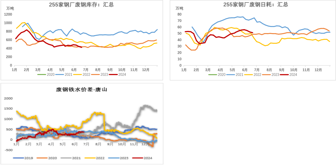 上半年255钢厂废钢日均消耗48万吨/日,同比45万吨/日增6.7%。4-5月份铁矿价格上涨明显,废钢性价比凸显,日耗量增加,6月份日耗随着铁水成本下跌有所下降。