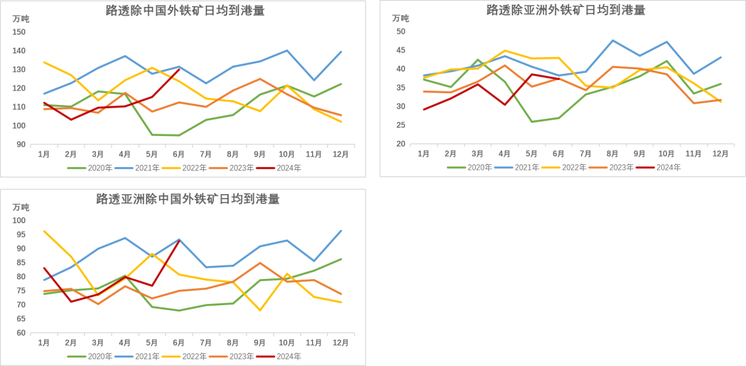 上半年海外日均到港水平呈回升趋势,6月到港增量明显。除中国外地区日均到港113万吨/日,同比110万吨/日增2.7%;亚洲以外地区日均到港33.9万吨/日,同比36.3万吨/日下降6.7%;亚洲除中国外日均到港79.5万吨/日,同比74.1万吨/日增7.3%。