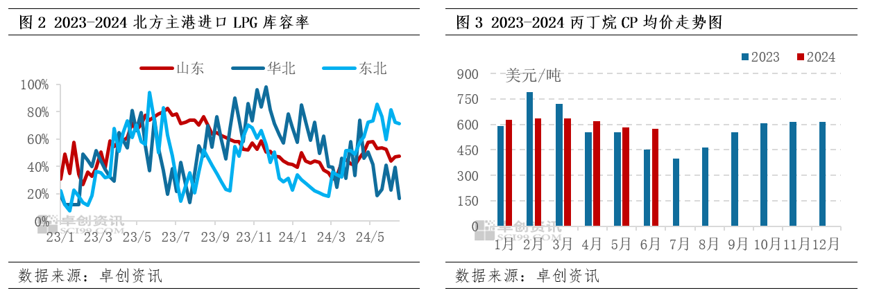 从北方主港进口LPG库容率来看,6月份除华北市场港口库存维持相对可控位置之外,山东地区维持在近5成的库压水平,而东北市场月内平均库容率在7成左右,中位及偏高库压对于厂家来说相对被动,尤其季节性需求淡季下终端消耗缓慢,多以优先出货为主,进而导致价格出现下跌。