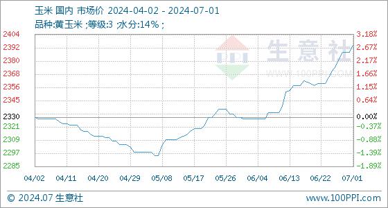 7月1日,生意社玉米基准价为2388.57元/吨,与上月初(2328.57元/吨)相比,上涨了2.58%。