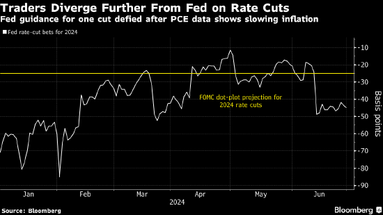 10年期收益率周五下降约2个基点至4.26%,月降幅扩大至23个基点,料为去年12月以来最大。2年期收益率下跌约2个基点至4.68%,延续6月跌势。利率互换交易员预计今年降息幅度约为45个基点,到11月结束前肯定会降息一次。