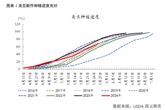 目前美豆新作开始进入种植周期,当前天气情况以及种植进度均表现良好。据气象机构显示,美国平原的土壤表层及亚层墒情有所改善,截至6月11日当周,约1%的美国大豆种植区域受到干旱影响。据美国农业部(USDA)周二凌晨公布的每周作物生长报告显示,截至6月16日当周,美国大豆种植率为93%,市场预期为94%,此前一周为87%,去年同期为97%,五年均值为91%;出苗率为82%,上一周为70%,上年同期为90%,五年均值为79%;优良率为70%,市场预期为71%,此前一周为72%,上年同期为54%。