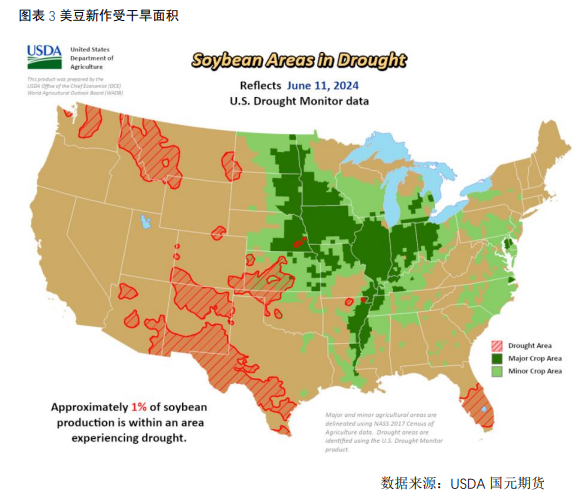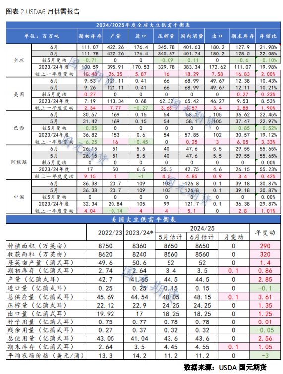 6月12日美国农业部发布6月份供需报告,维持美国大豆单产、面积不变,调低了2023/24年度美国大豆压榨,调高了近两年美国大豆期末库存。美国农业部预测2024/25年度美国大豆产量达到44.50亿蒲,平均单产为52.0蒲/英亩,均和上月预测持平。2024/25美国大豆期末库存预计提高到4.55亿蒲,高于上月预测的4.45亿蒲,这是因为2023/24年度的期末库存从3.40亿蒲调高到3.50亿蒲,以反映压榨调低到22.9亿蒲(上月预测23亿蒲)。由于供应充足,美国农业部预测2024/25年度美国大豆年度农场均价将会跌至11.20美元/蒲,较2023/24年度预期均价12.55美元/蒲下跌10.76个百分点。