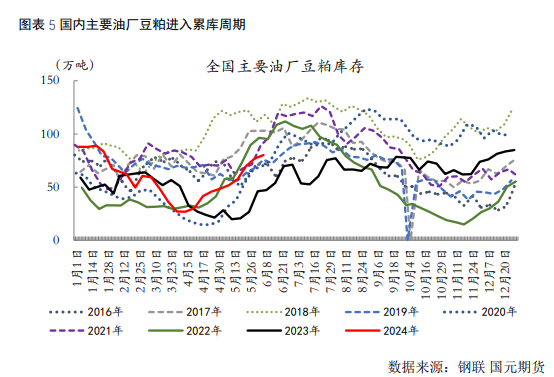 随着进口大豆到港量持续上行,叠加巴西大豆易变质储存时间较短,近几月为大豆到港高峰期,油厂在到港压力下保持较高开机率,5月以来全国油厂开机率保持在50%-65%的较好水平。今年水产养殖对蛋白粕的需求相对有限,叠加气温升高养殖端需求减量和夏季豆粕储存不便的情况下,饲料养殖企业建库心态谨慎致使豆粕提货进度较慢。豆粕终端需求疲软。受强供应弱需求带动,国内进口大豆库存及豆粕库存均出现底部拐点。据Mysteel对国内125家油厂调查数据显示:截至6月14日,全国豆粕库存为99.49万吨,较上周增加10.54万吨,增幅11.85%,同比去年增幅63.23%。