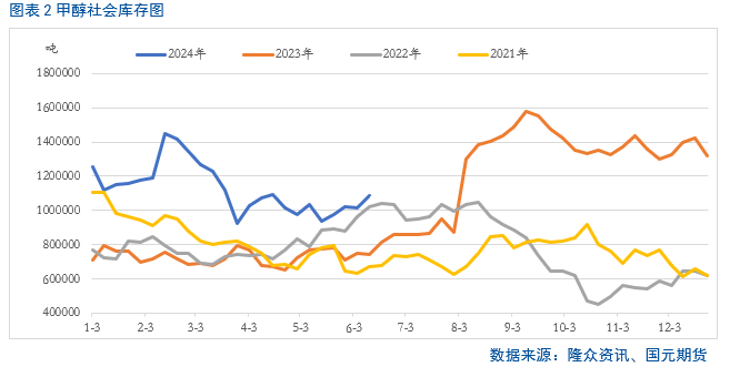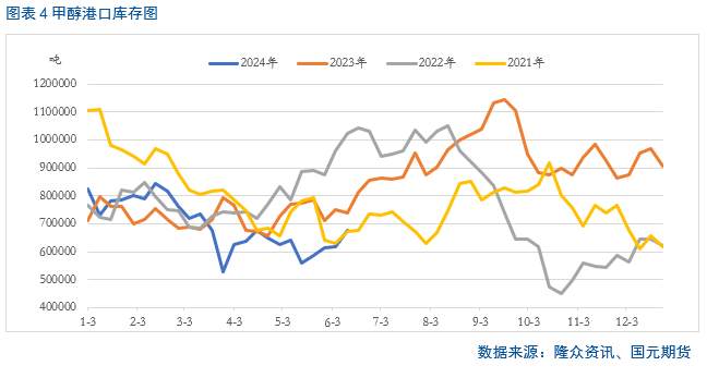 前期支撑甲醇走高的供应端在近期逻辑已发生改变。目前国内在国内供应快速拉升、港口库存持续回升的背景下,甲醇的社会库存呈现持续累库的局面,且位于近四年同期高位,对盘面存在较大的压制。