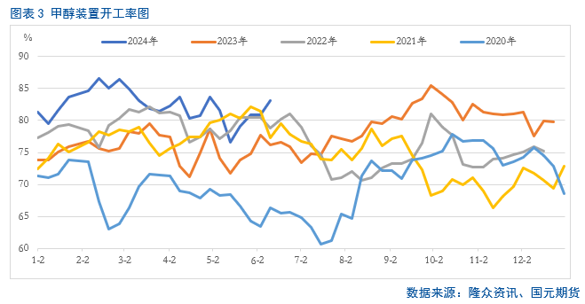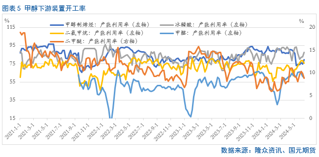 从下游市场需求来看,占比最大的MTO近期装置开工率虽有回升,但是由于多套装置亏损检修,MTO开工维持同期低位,对上游甲醇市场存在一定的负反馈。而传统下游,例如冰醋酸、二氯甲烷和甲醛尚维持一定韧性,但是由于占比较低,支撑也相对有限。因此综合来看,目前下游市场甲醇需求整体表现一般,对上游市场整体支撑力度不足。