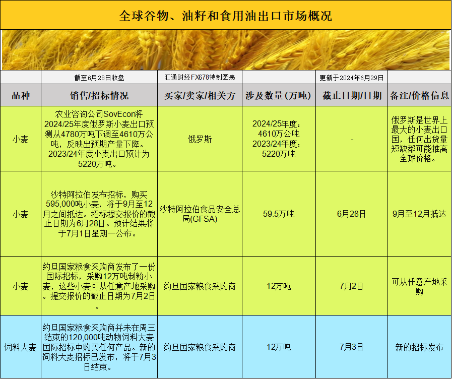 全球谷物、油籽和食用油出口市场招标、采购概况(24年6月29日):