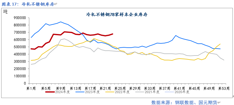 需求方面,需求有所走弱,库存由降转增。产业在线发布的三大白电排产报告显示:6月空冰洗排产总量合计为3557万台,较上月环比下降 5.77%。截至6月7日,78家样本企业不锈钢社会库存为104.88万吨,连续两周增加,其中冷轧库存增幅明显。
