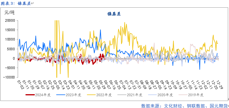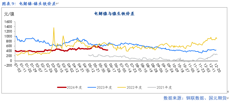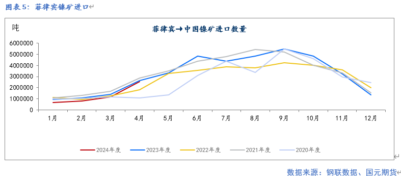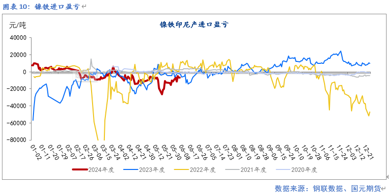 供应端不确定性缓解,镍矿进口环比回升。印尼能源和矿产资源部 (ESDM) 表示,已批准 470 家镍公司的三年期工作计划和预算 (RKAB),核定镍矿石开采额度达到每年2.4亿吨,镍矿供应偏紧预期缓解,后市需跟踪实际审批情况。5月全球镍矿发运量回升,中国港口到港量环同比增加。据Mysteel统计,5月全球主要国家共发运镍矿约675万湿吨,环比增加30.20%,同比增加12.82%。菲律宾镍矿发货约594万湿吨,环比增加31.98%,同比增加14.85%。中国主要港口镍矿到货约616万湿吨,环比增加55.22%,同比增加18.77%。