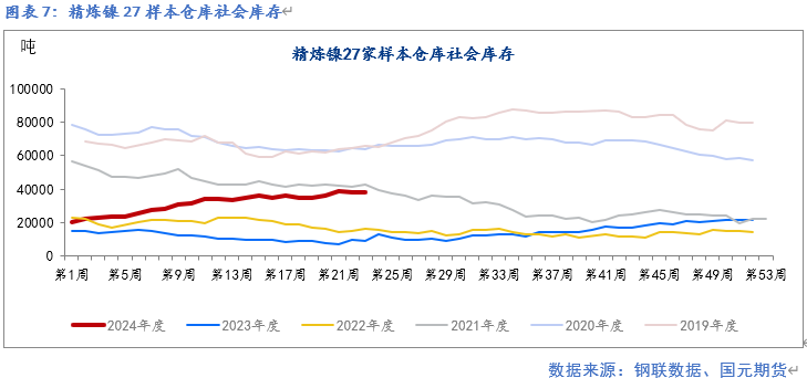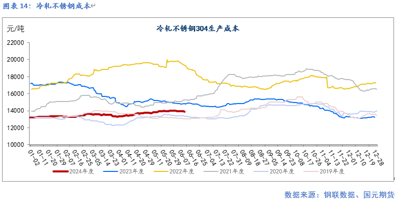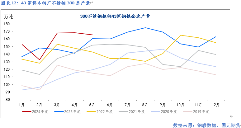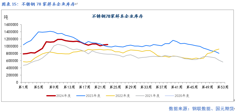 需求方面,新能源需求或进一步走弱,不锈钢排产增加,总体需求尚可。欧盟委员会6月12日发表声明,拟从7月4日起对从中国进口的电动汽车征收临时反补贴税,税率为17.4%至38.1%不等。欧盟对电动汽车制裁,或导致新能源需求进一步走弱。据Mysteel统计,2024年5月国内43家不锈钢厂300系165.285万吨,月环比减少1.8%,6月排产169.835万吨,月环比增加2.75%。