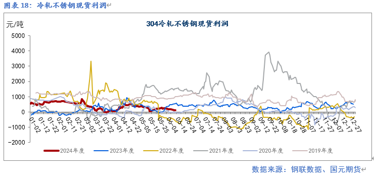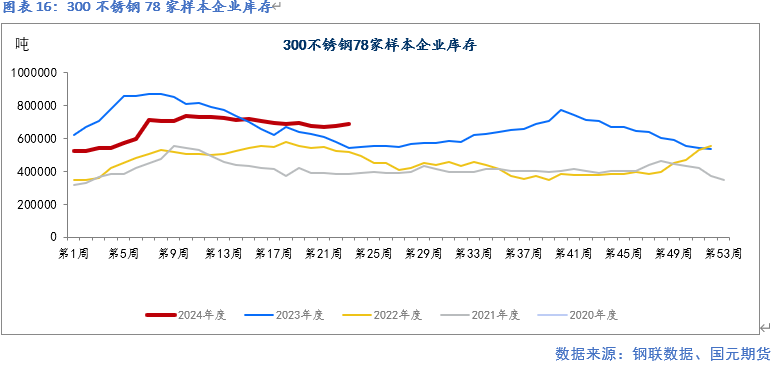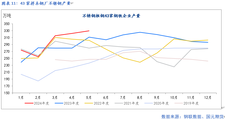 钢厂利润有所收缩,6月钢厂排产仍有增量。近一周,304不锈钢冷轧卷板利润率(自产高镍铁)维持在1.7%,较五月下旬明显下降。据Mysteel统计,2024年5月国内43家不锈钢厂粗钢产量329.98万吨,月环比增加7.87万吨,增幅2.44%,同比增加5.58%。6月预计排产336.53万吨,月环比增加1.98%,同比增加10.41%,其中300系169.835万吨,月环比增加2.75%。