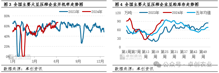 原料充足支撑开机水平较高,市场货源宽松,上游较大的豆粕库存施压现货价格及现货基差价格。据卓创资讯统计数据显示,6月国内主要大豆压榨企业平均开机率为60.77%,环比上月提高2.78个百分点,保持较高水平。截至6月21日,全国主要大豆压榨企业豆粕总库存为93.90万吨,环比上月底增加13.91万吨,且均高于去年及五年平均水平。千万吨以上的大豆预估到港量叠加气温条件不利存储,上游生产计划多数稳定,被迫保持相对较高的开机率。而下游需求不足以消化如此水平的豆粕供应,上游库存持续增加,催促提货为主,甚至部分企业胀库停机,对于市场情绪、盘面等皆有一定程度的拖累,利空豆粕现货价格及现货基差价格。根据目前买船、发船情况来看,7月大豆预估到港量或维持千万吨水平,原料宽松支撑开机水平保持高位。而需求端在养殖利润欠佳及进食量受天气影响或有所限制的情况下,下游消耗量整体或持稳,豆粕库存短期难有明显减量,将压制豆粕价格上方空间。