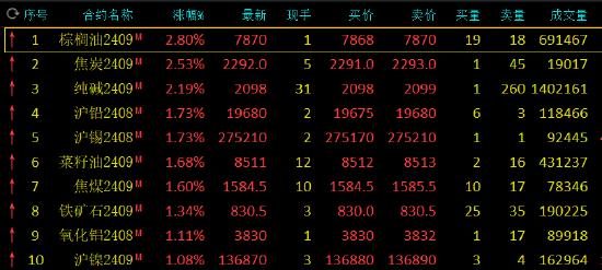 早盘收盘,国内期货主力合约涨多跌少,棕榈油涨近3%,焦炭、纯碱涨超2%,焦煤、沪锡、沪铅、菜油涨近2%,铁矿、沪镍、豆油涨超1%。跌幅方面,尿素跌近3%,烧碱跌超2%,碳酸锂、红枣跌近2%,玉米跌超1%。