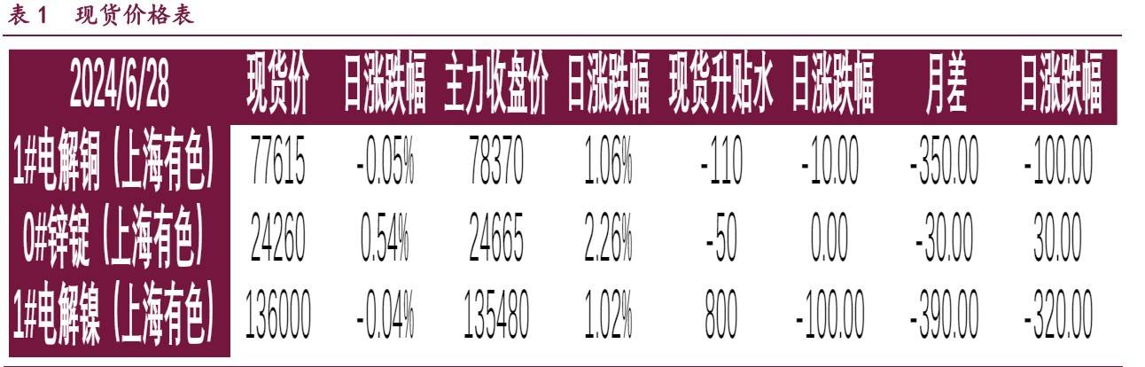 6 月 28 日,精炼镍上海市场主流参考合约沪镍 2408 合约。金川电解主流升贴水+1800 元/吨,价格 137070 元/吨;俄罗斯镍主流升贴水-200 元/吨,价格 135070 元/吨;挪威镍主流升贴水+5400 元/吨,价格 140670 元/吨;镍豆主流升贴水-500 元/吨,价格 134770 元/吨。