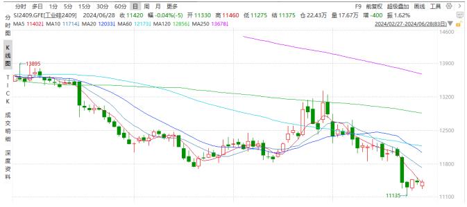 由于房地产利好政策以及电力市场化改革等消息刺激,五月份工业硅期货出现短暂反弹行情,最高点涨至13325元/吨,但六月再度转弱,全月一直维持震荡走势的趋势,其中6月24日主力合约大幅回落5.28%,快速跌破前期支撑位,创上市以来新低。最终六月份主力09合约跌幅达11.88%,完全抹去上月阳线。现货方面,六月上旬现货价格持稳运行,而中下旬市场成交重心逐步下移。由于丰水期到来,四川、云南地区电力成本下调,硅厂开工逐步增加,供应增量加速兑现,但下游需求增量却相对不足,叠加库存水平高位,整体供需面较弱,市场价格持续弱势。