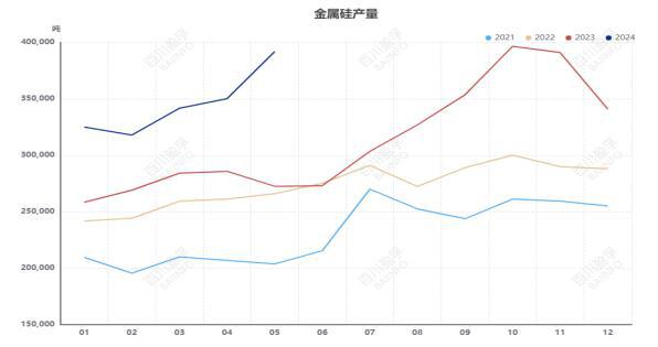 据百川盈孚统计,六月份全国工业硅总产量43.9万吨,同比增长60.82%。主产区增速较为明显,其中新疆地区产量22.07万吨,同比增长63.68%,约为全国产量的一半。四川产量5.2万吨,同比增长30.65%,云南产量5.73万吨,同比增长74.96%。从开炉情况来看增速也较为明显,截止6月28日,工业硅矿热炉共733台,其中正常开启424台,开炉率为57.84%,开炉数量与5月31日相比增加78台。分区域来看,西北地区工业硅开工减少,其中新疆地区开炉数166台,陕西开炉数3台,青海开炉数5台,甘肃开炉17台。西南地区工业硅开工增加,云南开炉90台,四川地区开炉74台,重庆地区开炉9台。福建地区开工5台,而东北地区工业硅开工11台,内蒙古地区目前开炉22台,广西地区开工2台,湖南开工3台。整体上看,目前新疆开工已处于高位,除新增产能投产,现有企业继续增产空间不大,而南方丰水期到来,四川、云南开工率高位,七月云南正式进入丰水期,复工硅厂将继续增加,产量将继续释放。