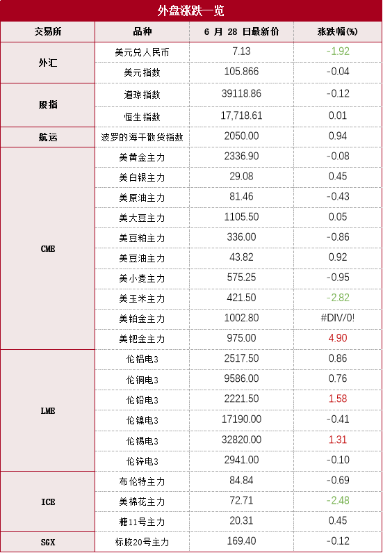 隔夜,LME铜收跌72美元,涨幅0.76%,LME铝收涨21美元,涨幅0.86%,LME锌收跌3美元,跌幅0.1%,LME镍收跌70美元,跌幅0.41%,LME锡收涨425美元,涨幅1.31%,LME铅收涨34美元,涨幅1.58%。消息面:美国5月核心PCE物价指数同比升2.6%,预期升2.6%,前值升2.8%。美国上周初请失业金人数为23.3万人,预期23.6万人。美国第一季度核心PCE物价指数年化终值环比升3.7%,预期升3.6。欧元区6月制造业PMI初值45.6,为6个月以来新低,预期47.9。上周,国内主要大中型铜杆企业开工率为69.02%,环比下降1.14个百分点。Antofagasta与中国冶炼厂就2025年50%的铜精矿供应量的长单TC/RC敲定为23.25美元/干吨及2.325美分/磅。据SMM调研,上周国内主要大中型铜杆企业综合开工率为70.15%,较前周环比上升5.41个百分点。最新全国主流地区铜库存增1.25万吨至39.91万吨,国内电解铝社会库存增0.2万吨至76.3万吨,铝棒库存减0.7万吨至14.35万吨,七地锌库存增0.08万吨至19.46万吨。金属库存小幅回落,欧洲率先降息,美元震荡。操作建议,短线偏空交易思路为主,买氧化铝卖电解铝套利持有。观点仅供参考。