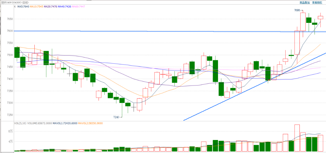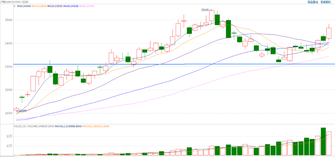 截至前一个交易日收盘,沪锌高开高走,收中阳线。23000附近是密集成交区,存在一定支撑。