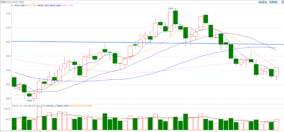 截至前一个交易日收盘,玻璃尾盘拉升,收中阳线。日k线呈M头形态,并跌破60日均线支撑。