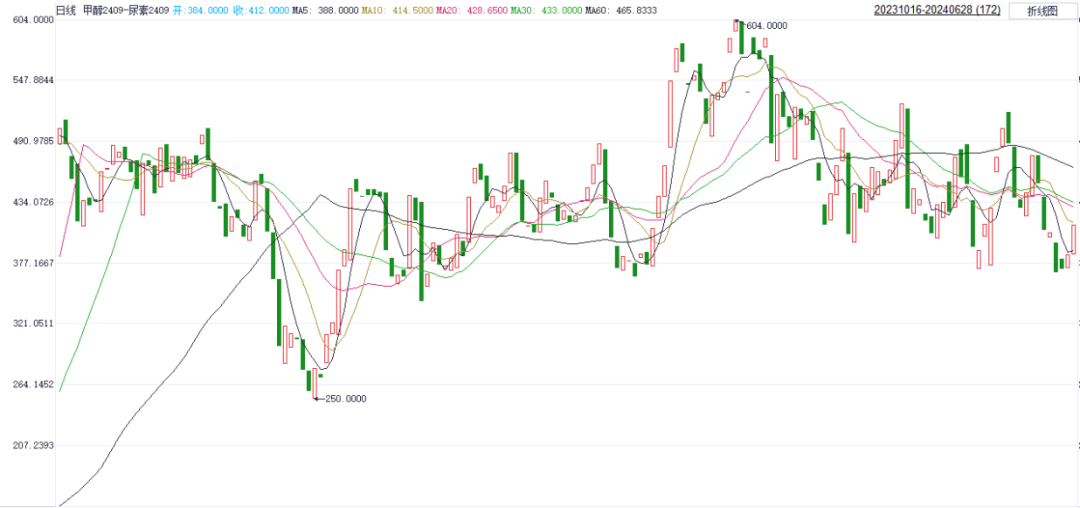 操作策略:空甲醇多尿素09为跨品种套利组合策略,该策略首推日为6月5日,推出时差价为371,目前最新差价412,可继续观察差价的进一步的变化。若差价回升上破421取消关注。