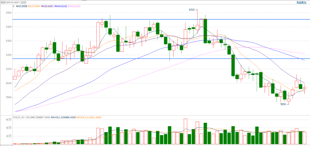截至前一个交易日收盘,纸浆窄幅波动,收小阳线。日k线突破近期震荡区间下边界,打开下行空间。