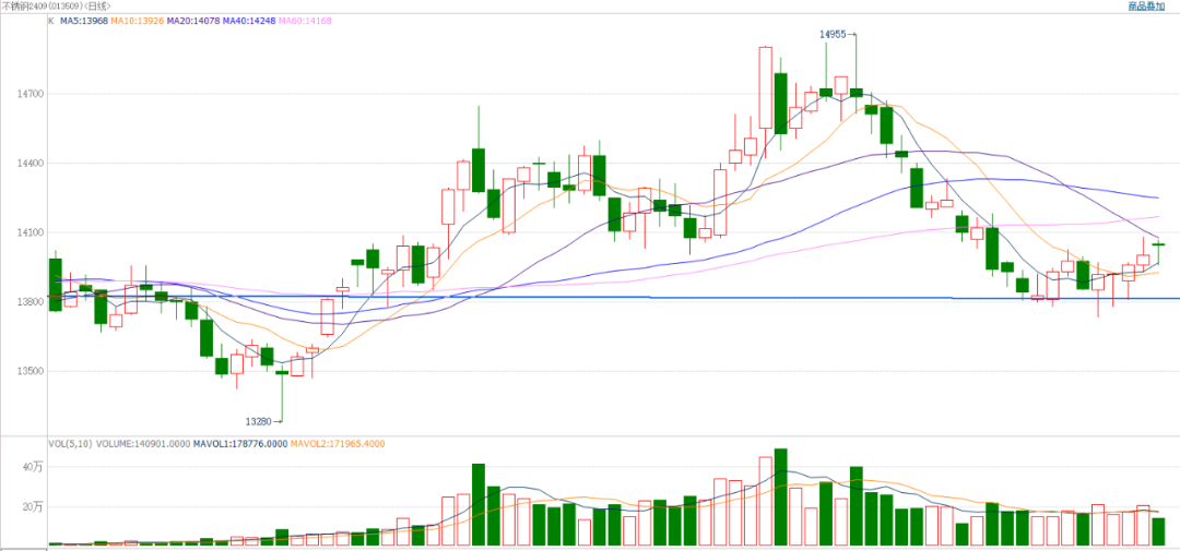 截至前一个交易日收盘,不锈钢跳空高开,探底回升。日k线在13800存在较强支撑,市场企稳反弹。