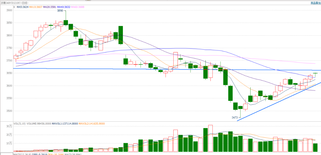 截至前一个交易日收盘,沥青跳空高开,收小阴线。日k线整体震荡上行,并站稳10日均线。