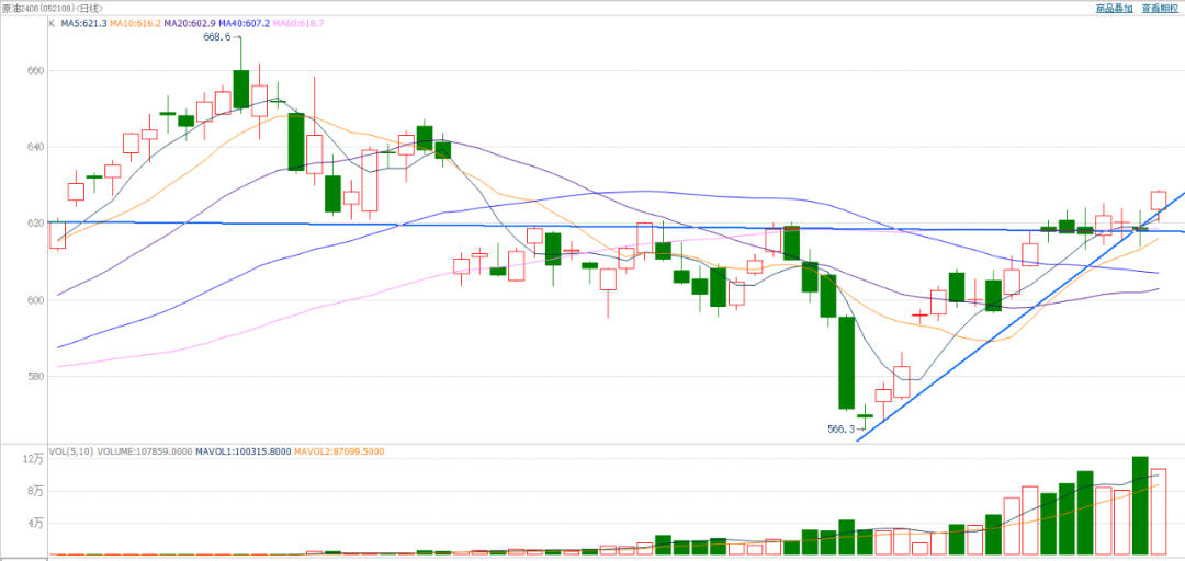 截至前一个交易日收盘,原油高开高走,收小阳线。日k线整体震荡上行,并突破620附近压力。
