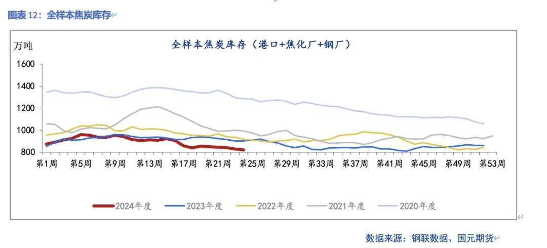上周全样本焦炭库存延续下降,减量主要体现在独立焦化厂方面。上周样本钢厂、焦化厂及港口焦炭总库存821.93万吨,周环比下降3.78万吨,连续五周下降。