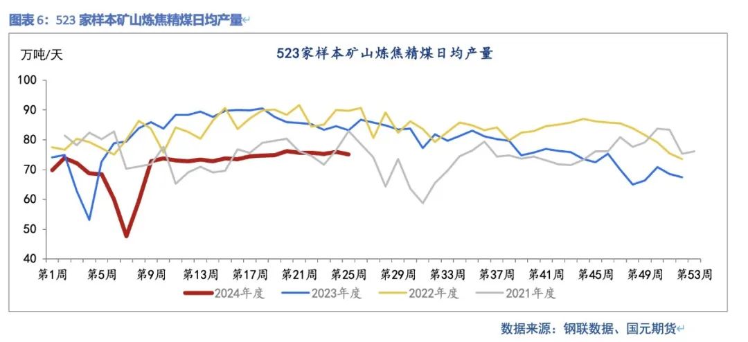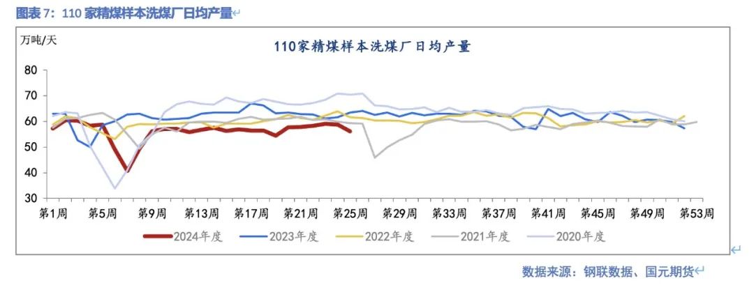 六月为安全生产月,焦煤矿山增量有限。Mysteel数据显示,本周523家样本矿山炼焦原煤日均产量为197.12万吨/天,环比下降2.48万吨/天;精煤日均产量75.07万吨/天,环比下降0.87万吨/天。黑龙江受前期停产煤矿验收不合格影响,洗煤厂开工率进一步下降。本周110家洗煤厂开工率66.57%,环比下降2.38个百分点。