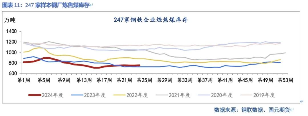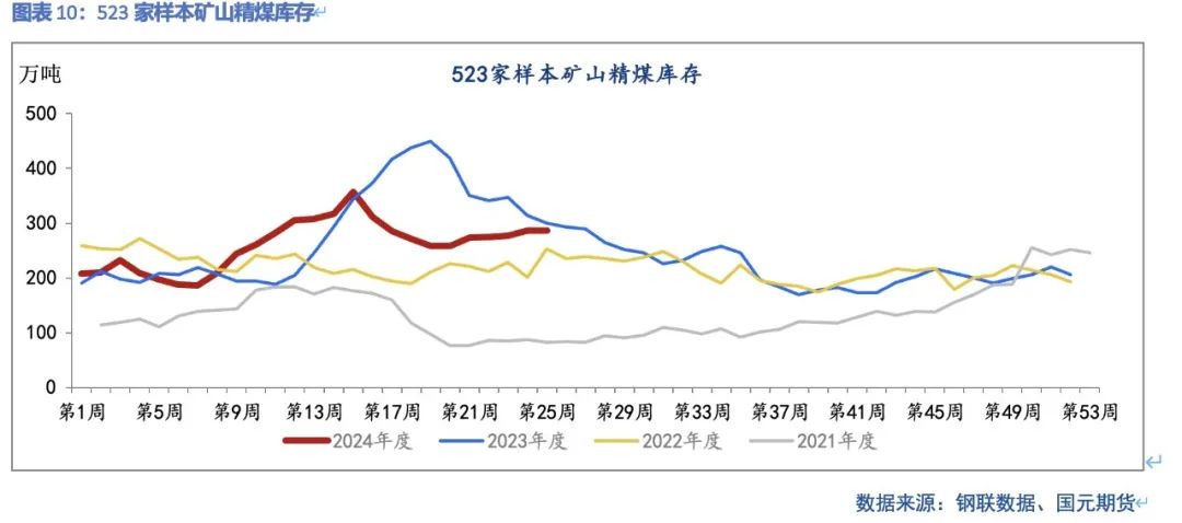 上周523家样本矿山精煤库存286.56万吨,环比下降0.39万吨,增幅放缓;上周110家样本洗煤厂精煤库存174.58万吨,环比下降4.16万吨。钢厂及焦化厂焦煤补库放缓。上周247家样本钢厂库存756.38万吨,周环比增加5.59万吨;270家样本焦化厂焦煤库存925.93万吨,周环比下降21.32万吨。