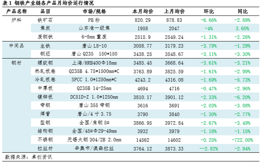 6月钢铁产业链产品价格走势以震荡下行为主,在统计的品种范围内,原料矿石和焦炭价格跌幅超前,环比分别下跌6.66%和4.4%,成品螺纹钢、拉丝材跌幅均在3%左右。分析价格下跌原因主要有:一是成本下移驱动,6月原料跌幅较大,成本推动价格下跌。二是下游需求表现不佳,成材端在高温、汛期影响下,淡季需求疲弱。三是5月经济数据表现较差,市场信心不足,此前超预期地产政策利多基本已消化以及市场降息预期落空也抑制了市场情绪。
