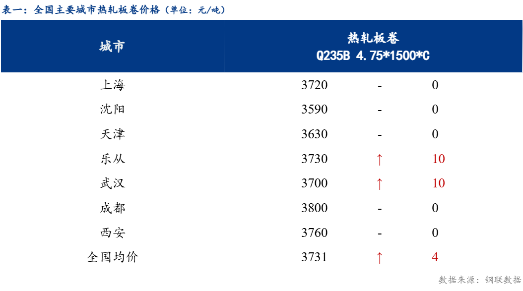 截止发稿时4.75热轧板卷全国均价3731元/吨,较上一交易日上涨4元/吨。其中主要城市价格为上海3720元/吨,沈阳3590元/吨,天津3630元/吨,乐从3730元/吨,武汉3700元/吨,成都3800元/吨,西安3760元/吨。