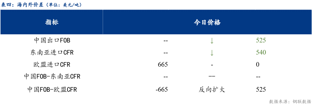 从海内外价差情况来看,中国热卷出口在525美元/吨,较上一交易日持平;欧盟进口价格665美元/吨,较上一交易日持平。