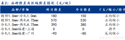 福建市场品种价差来看,镀冷品种今日价差150元/吨,较昨日正向缩小;镀热价差530元/吨,较昨日正向缩小,冷热价差380元/吨,较昨日正向缩小。区域价差来看,冷轧品种,福州-上海市场进入无价差,较昨日持平;福州-广州市场今日价差80元/吨,较昨日反向缩小。