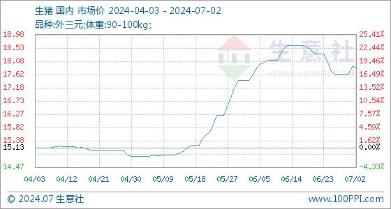 7月2日,生意社生猪基准价为17.90元/公斤,与本月初(17.63元/公斤)相比,上涨了1.53%。