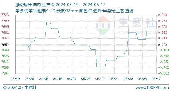 6月17日,生意社涤纶短纤基准价为7696.00元/吨,与本月初(7682.00元/吨)相比,上涨了0.18%。