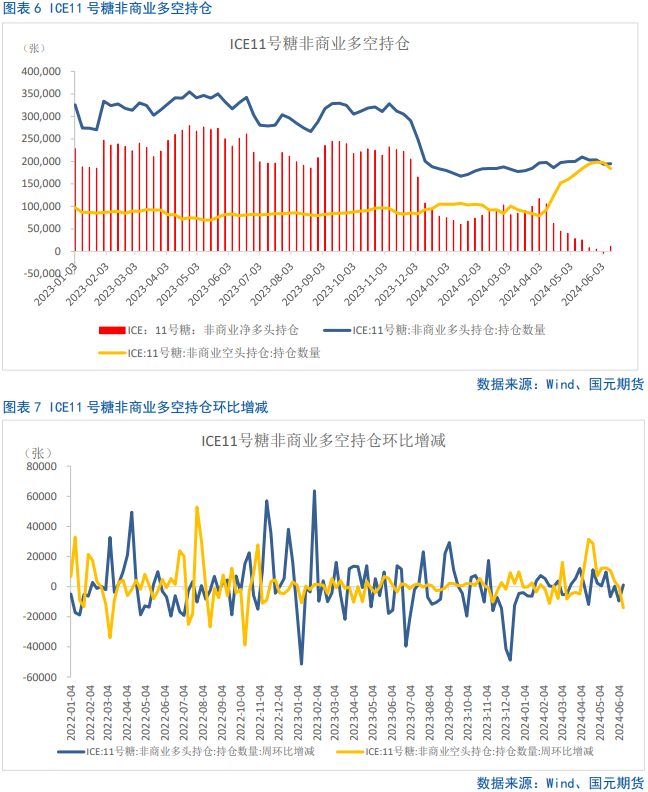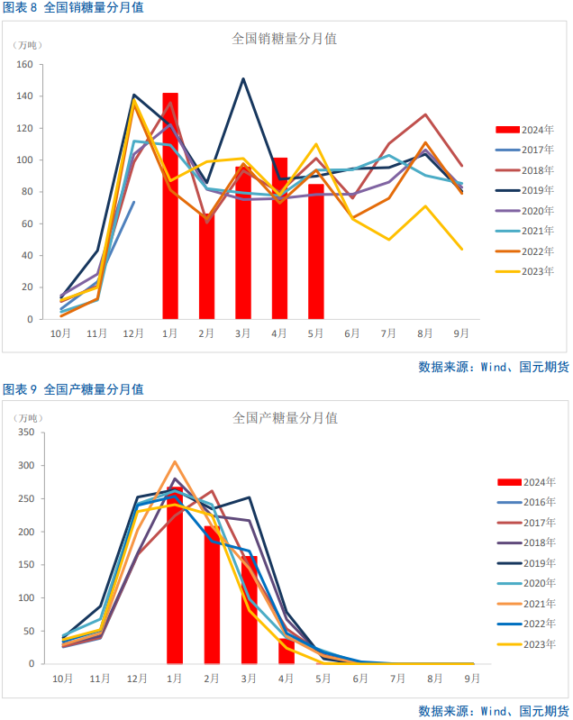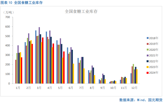 本榨季国内食糖销售量同比偏快,整体上快于历年销糖进度,截至2024年5月,累计产销率为66.17%,全国食糖工业库存337.04万吨,处于近7个榨季的次低水平;我国近3个月白糖进口糖极度偏低,据海关总署6月18日公布的数据显示,我国5月食糖进口量为2万吨,同比减少51.8%。
