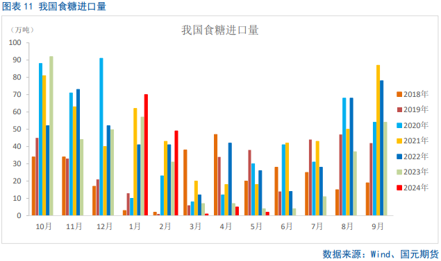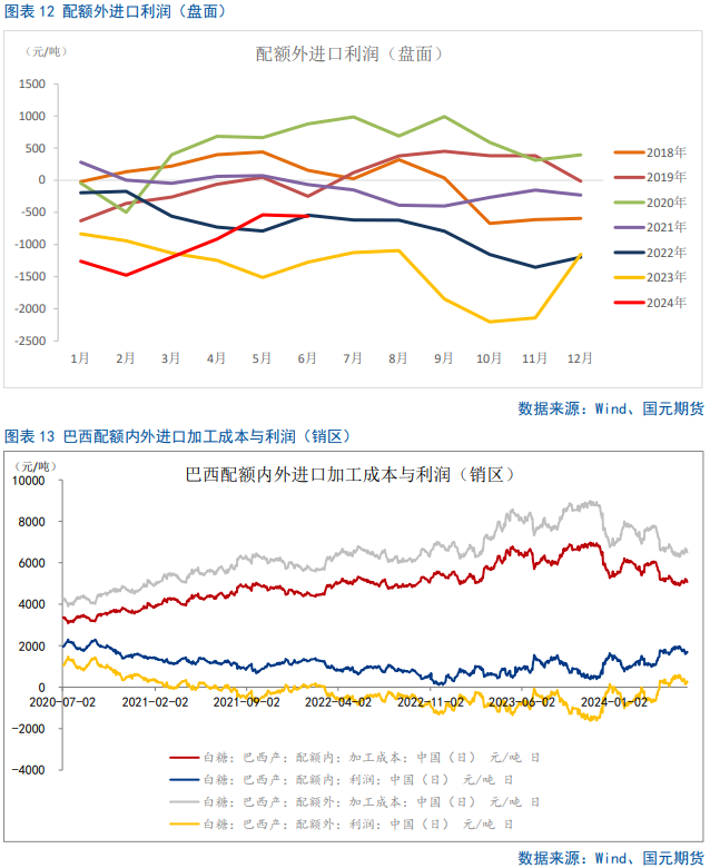 2024年3-5月,我国食糖进口量严重低于去年同期水平,考虑到2个月的船期,3-5月的买船到港正值巴西糖配额外利润为负时的时间窗口;2024年4月原糖大跌之后,巴西糖配额外进口利润打开且转正,高于2023年与2022年同期时的配额外进口利润区间,此时加工糖厂点价后的买船到港时间将为6-7月。