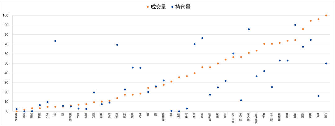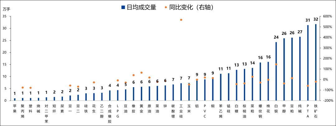 (4)日均成交量前三品种依次为PTA(32万手)、铁矿石(32万手)和纯碱(26万手),只有10个品种的日均成交量实现正增长。