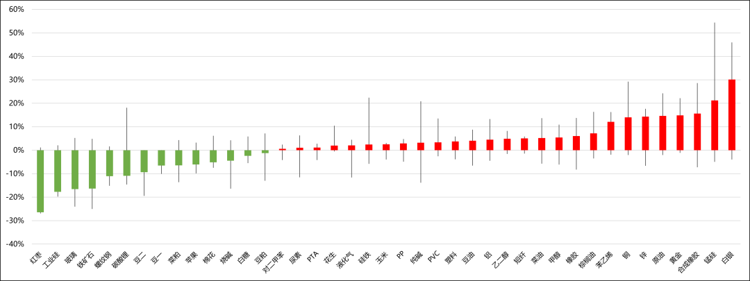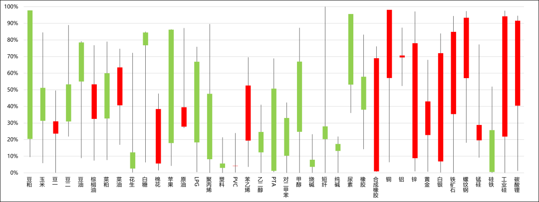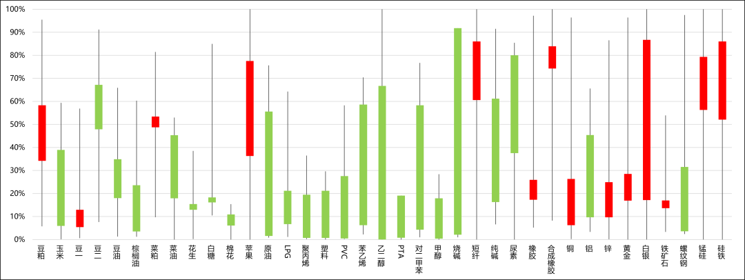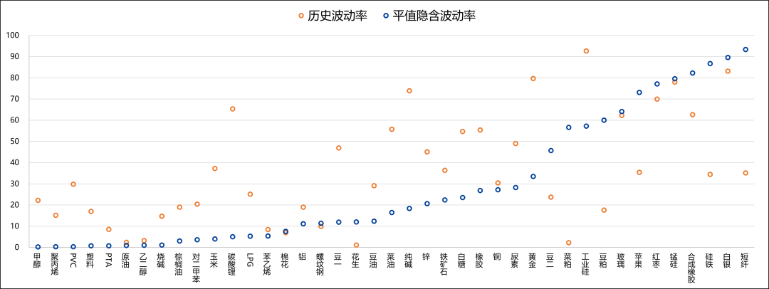 (10)综合考虑历史波动率和平值隐含波动率,当前白银和锰硅的波动率偏高,乙二醇、原油、和苯乙烯的波动率偏低。