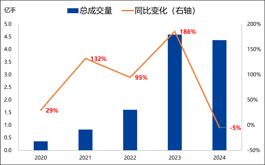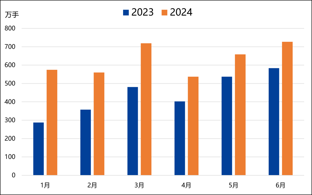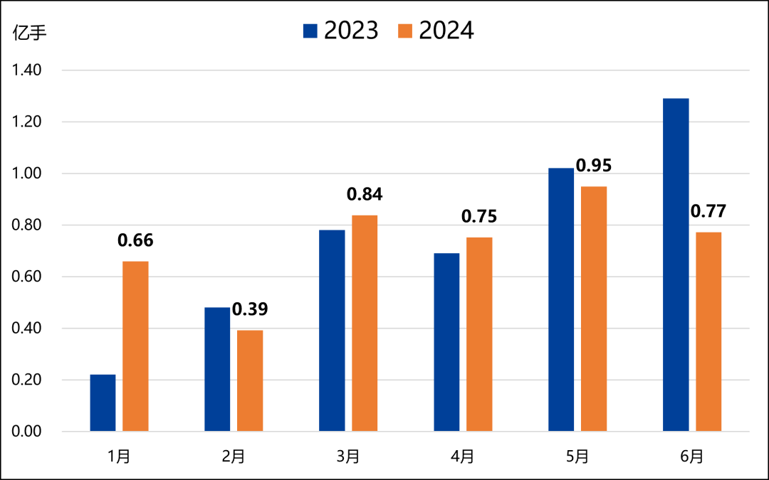 2024上半年商品期权成交总量达到4.4亿手,日均成交量为373万手,二者同比均减少6.4%,为商品市场诞生至今首次负增长。因政策原因,2月成交量小幅减少,因行情平淡,5月和6月成交量进一步减少。