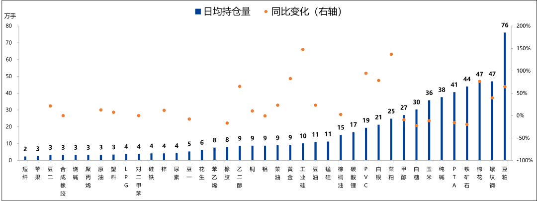 (5)日均持仓量前三品种依次为豆粕(75万手) 、棉花(47万手)和螺纹钢 (47万手) ,31个品种的日均持仓量实现正增长。