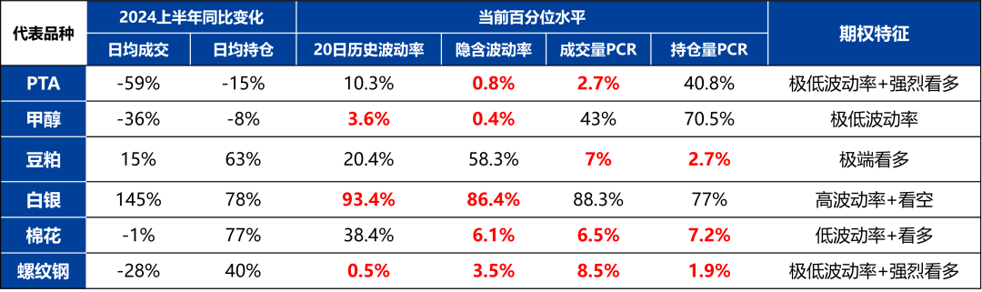 当前PTA、甲醇和螺纹钢的期货和期权波动率均极低,同时期权PCR指标显示强烈看多情绪,下半年期货出现趋势性行情可能性较高,建议重点关注。