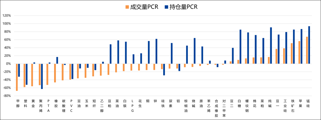 最新的成交量和持仓量PCR指标显示螺纹钢、短纤、菜粕、塑料和PVC的看多情绪较强烈,花生、锰硅和白银的看空情绪较强烈。