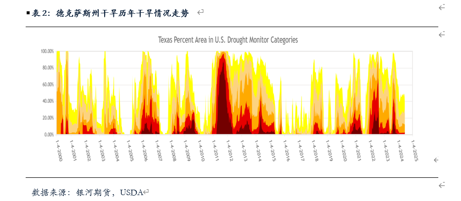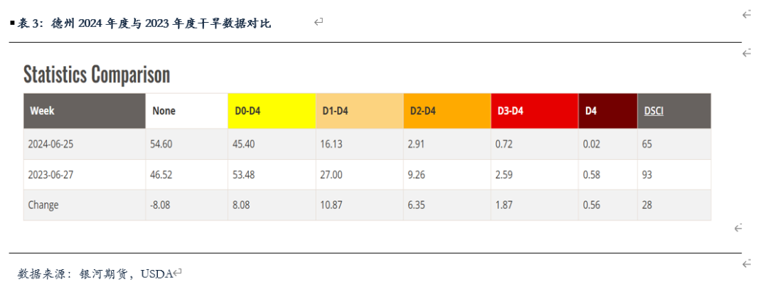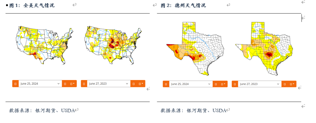 从数据也显示,美国以及美棉主产区德克萨斯州的土地情况对棉花生长较为适宜,主产区干旱指数远低于去年。根据USDA6月25日的数据显示,今年德州D4(最高级别干旱)区域面积低于去年;D3-D4区域占比仅为0.72%远低于去年同期的2.59%,D2-D4占比也远低于去年同期。预计今年美棉弃种率也将大幅下降。按照6月初USDA对美棉种植面积预测来看,预计新年度美棉的弃种率在14%左右。