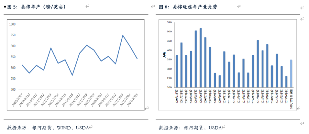根据USDA6月初数据,2024年度美棉播种面积为1067万英亩,最终收获面积预计913万英亩,弃种率约为14.43%,单产为842磅/英亩,同增加15.7%,总产量为348万吨,同比增加了32.5%。考虑到目前天气情况尚可预计新年度美棉的产量高于本年度水平。此外,根据6月28日公布的最新美棉播种面积来看,较6月初相比增加了9%,如果我们按照同比例增幅去推测美棉最终产量,美棉总产量可能调增至379万吨,结合历年产量来看,处于中等水平。